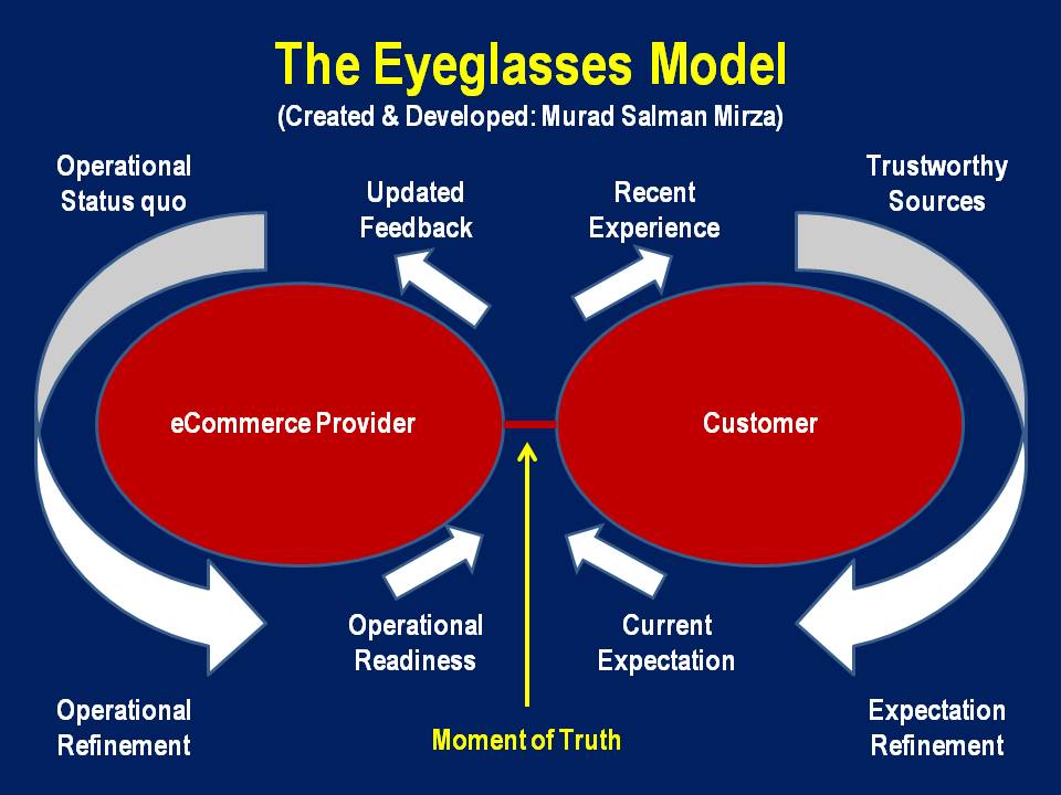 The aforementioned depiction is a qualitative characterization of the relationship between customer expectation and customer experience. If the Past Customer Experiences (PCE) with respect to a certain eCommerce provider are equal to zero, i.e., a first-time interaction, then the Customer Expectations (CE) are totally reliant on Trusted Sources (TS), e.g., family, friends, acquaintances, prominent multimedia sources, marketing material from the eCommerce provider, customer’s own self-confidence on random research or experiences with other eCommerce providers, etc. On the other hand, if both PCE and TS are equal to zero, then the customer is in the exceedingly rare position of proceeding with no expectations and is exposing himself/herself to an uncalculated risk. The interaction between an eCommerce provider and the customer can be illustrated through ‘The Eyeglasses Model’ as follows: