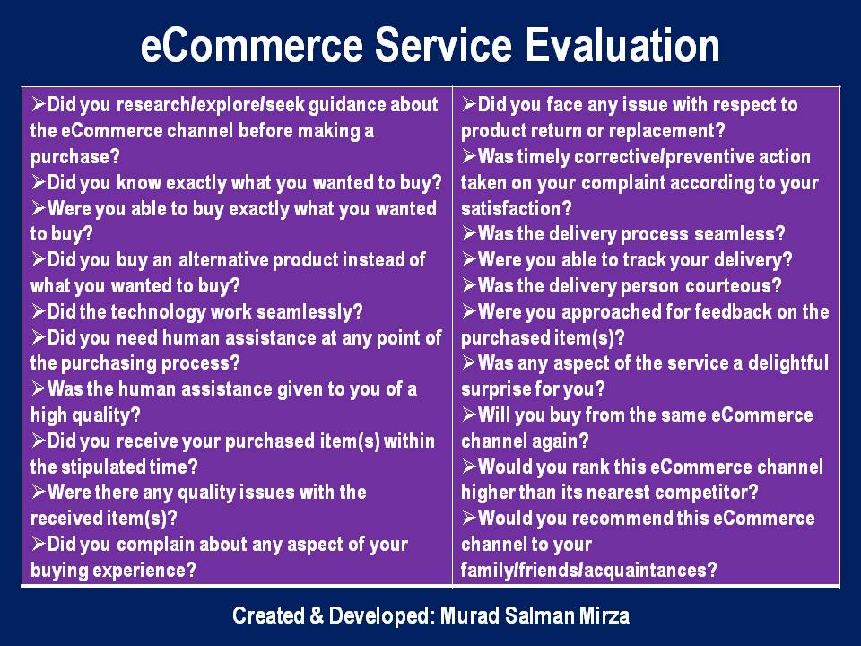 This includes, the developers behind the maintenance and upkeep of the technology, customer service professionals addressing the concerns of fickle customers, distribution personnel ensuring the safe and secure product/service delivery in a timely manner, etc. Therefore, it is critically important for the eCommerce provider to ‘own’ as much of the ‘journey’ as possible that transpires between the initial contact by the customers and the actual service/product deliveries to them. A critical part of such an equation is to value the treasure trove of inherent talent by taking care of their needs and expectations through the ‘prudently proactive’, rather than, ‘rationally reactive’ institutionalization of enlightened policies/processes/procedures. Following questions can be used as a guide in the respective context: