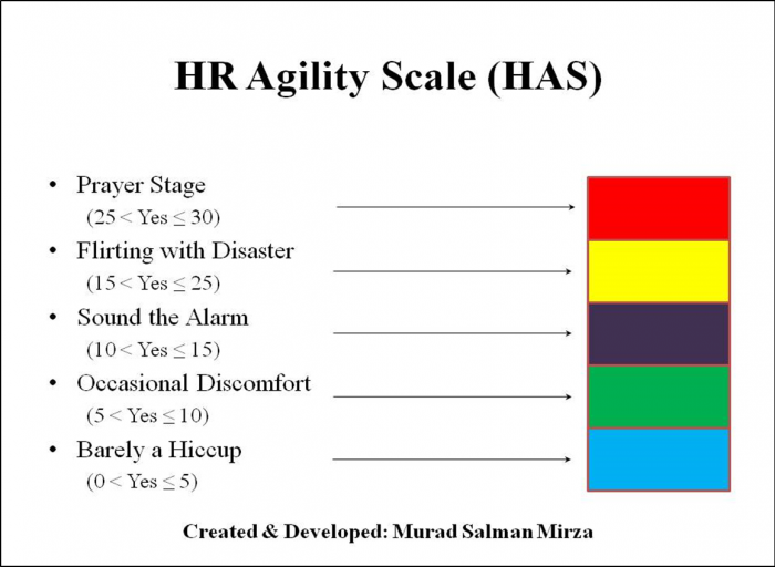 Another effective way to benefit from the HR Agility Scale (HAS) is to use it periodically, e.g., annually, for developing a temporal record of the status-quo in order to gauge the improvement level in the agility of the HR Function and the lessons learnt in terms of overcoming any impediments/challenges. This can also be tied to corroborating performance metrics, e.g., average time to hire, average cost per hire, average complaint resolution time, performance rating average of HR employees, bench strength for succession planning, problem employee rate, HR Function satisfaction rate, annual training and development (T&D) cost per employee, annual training and development (T&D) hours per employee, diversity and inclusion (D&I) rate, etc., and surveys from ‘client’ functions within the organization that can provide factual evidence of HR Function’s enhanced ability to meet/exceed expectations.