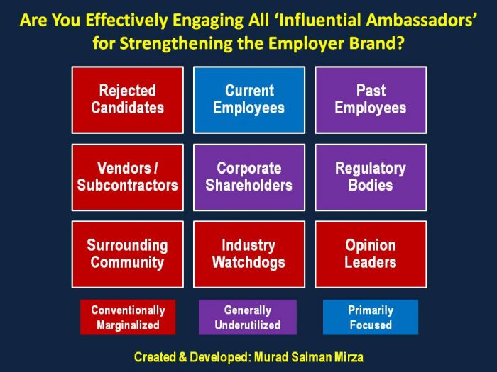 This refers to a broad group that includes rejected candidates, vendors/subcontractors, surrounding community, industry watchdogs and opinion leaders. Such a diverse aggregation of stakeholders has gained increased prominence in the Digital Age due to the ease of technology in being an effective voice for promotion/protest, especially, through social media. Most organizations don’t engage rejected candidates in terms of providing a positive ‘hiring experience’ as they are seen as acceptable ‘collateral damage’ of the recruitment and selection process without realizing the need for actively cultivating them for future positions. This is also being driven by the undulating economic environment that has resulted in a large pool of qualified candidates for limited roles who are routinely subjected to the indifferent categorization and filtration of the Applicant Tracking System (ATS) software that are substantially impervious to their long-term potential while screening within the narrow boundaries of tightly scripted job specifications to satisfy current needs. Consequently, a ‘rich’ source of sustaining a strong employer brand is diluted due to shallow thinking. This should be religiously improved as an organizational imperative since ‘rejected candidates’ generally follow the traits of unsatisfied/irate customers and are often at the vanguard of sullying an organization’s reputation, especially, during informal chats with their friends/family/professional acquaintances.