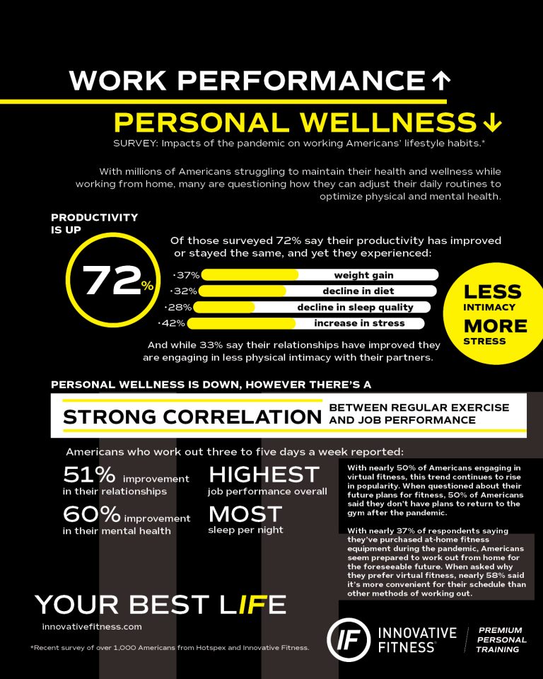 Americans have experienced a spike in productivity and work performance from teleworking during the pandemic, but their physical and mental health and wellness has suffered as a result. A new survey of over 1,000 Americans from boutique personal training club Innovative Fitness reveals surprising information about the lifestyle habits of Americans post-COVID.