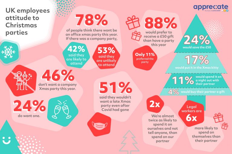 *Research shows British employees don’t want a Christmas party this year – and would prefer cash instead. In a sign of the times, given the choice between receiving £50 or having a company Christmas party this year, almost nine in 10 (88%) revealed they would prefer to receive a £50 gift instead to spend as they wish.