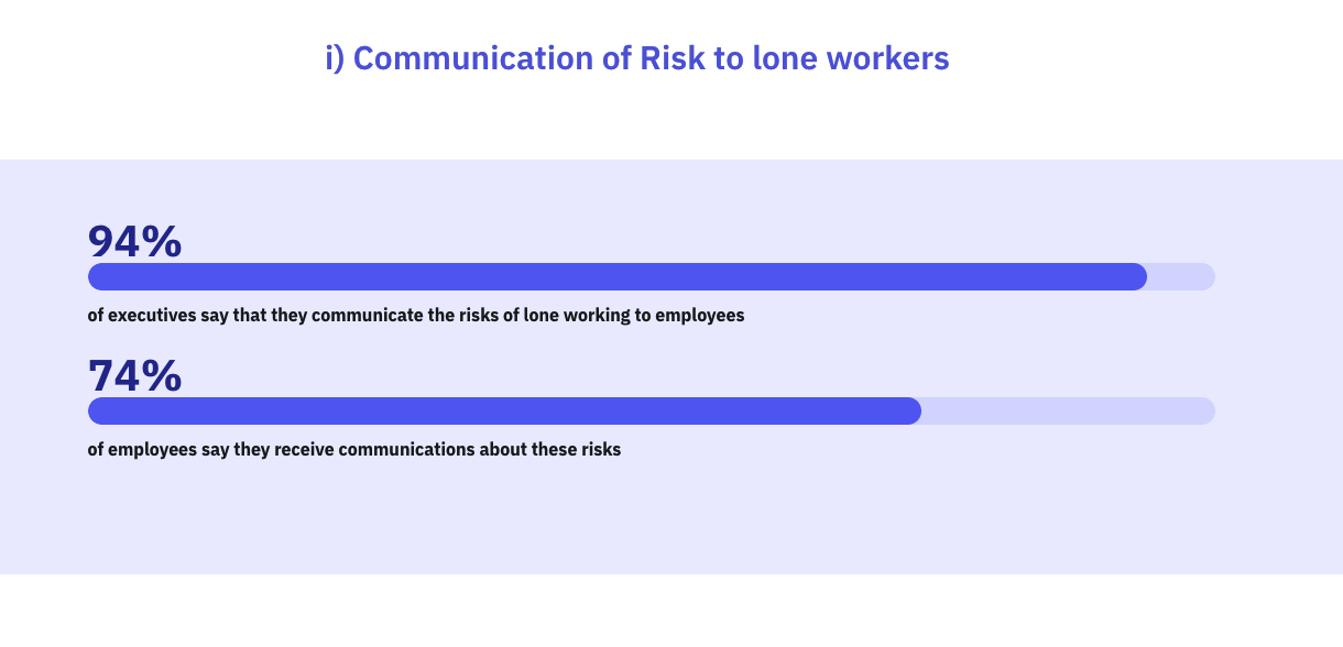 - Risk management: 46% of executives believe lone workers are adequately included in risk assessments, compared to only 30% of lone workers. While over half of the executives believe risk assessments occur regularly, only 31% of lone workers agree.