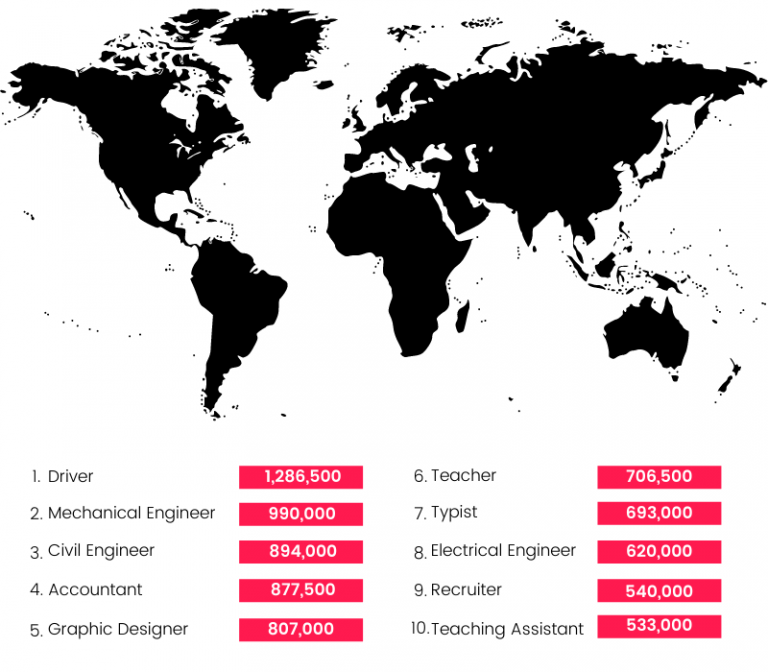 Engineering jobs make up the top three globally, with both mechanical and engineering jobs seeing close to a million searches per year, with other highly skilled careers such as graphic designer and accountant rounding out the top five with more than 800,000 searches for each. Canadians are searching for accounting jobs the most (54,201 searches), while it’s India that searches for engineering jobs (567,200) the most.