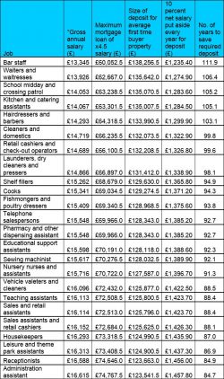 According to HouseSimple research, full-time bar staff on an average annual salary of £13,345 would have to save for a staggering 112 years to get onto the housing ladder. And hairdressers on the average income for the profession, would be able to afford to buy an average first-time buyer property by 2120. The most recent ONS Annual Salaries data** was used to compile the list of jobs, ranked by the length of time it would take someone in that job to have enough money for a deposit on a £198,309** property, the price of an average first-time buyer property in the UK according to the Land Registry.