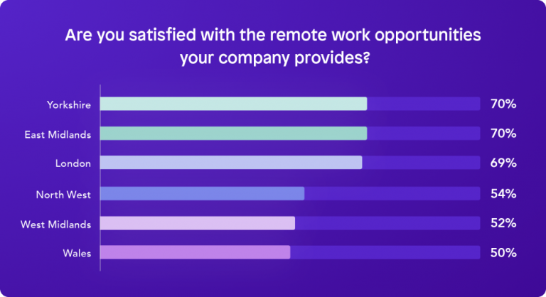 Satisfaction with remote working conditions varies across the UK: the North West, West Midlands, and Wales scored lowest (54%, 52%, and 50% respectively), while London, the East Midlands and Yorkshire faired the best (69%, 70%, and 70%). However, finance workers in London feel the most pressure from employers to attend the office; experienced by 33% of respondents in the capital compared to the national average of 19%.