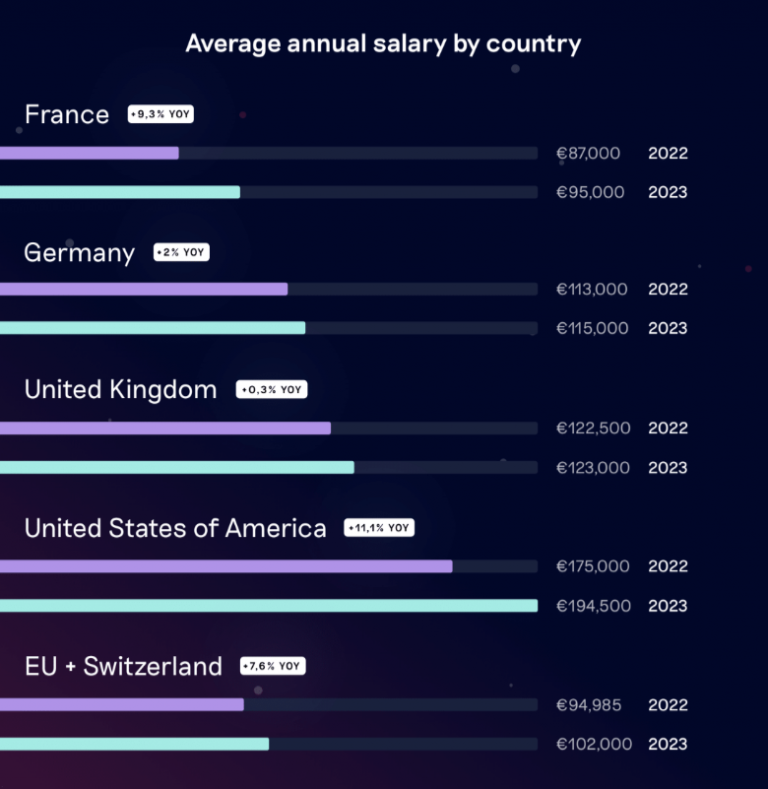 The average overall finance salary in the US is €194,380 / £167,030, which is almost double the €102,192 / £87,813 of Europe. In line with last year’s survey, the UK’s €122,896 / £105,604 average remains Europe’s highest.
