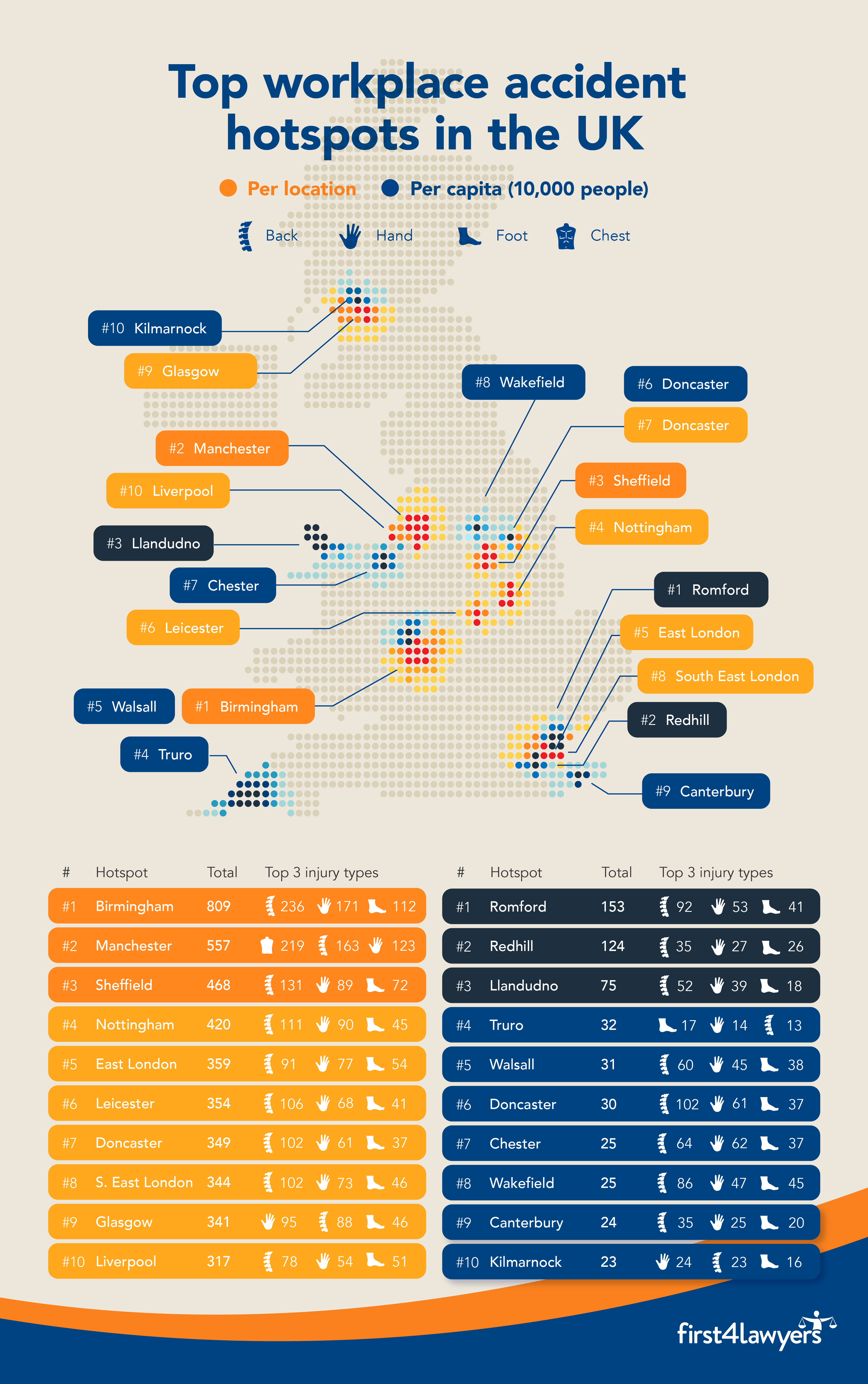 The northern cities of Birmingham, Manchester and Sheffield took the top three spots in the nationwide roundup with the southern towns of Romford and Redhill picked out as the top two key workplace accident hotspots per capita, closely followed by Llandudno.