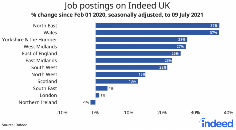 The return of crowds at events and entertainment venues may also partly explain the rebound in London job postings, which have finally returned to pre-pandemic levels — making the capital the last region in Britain to reach that milestone3.