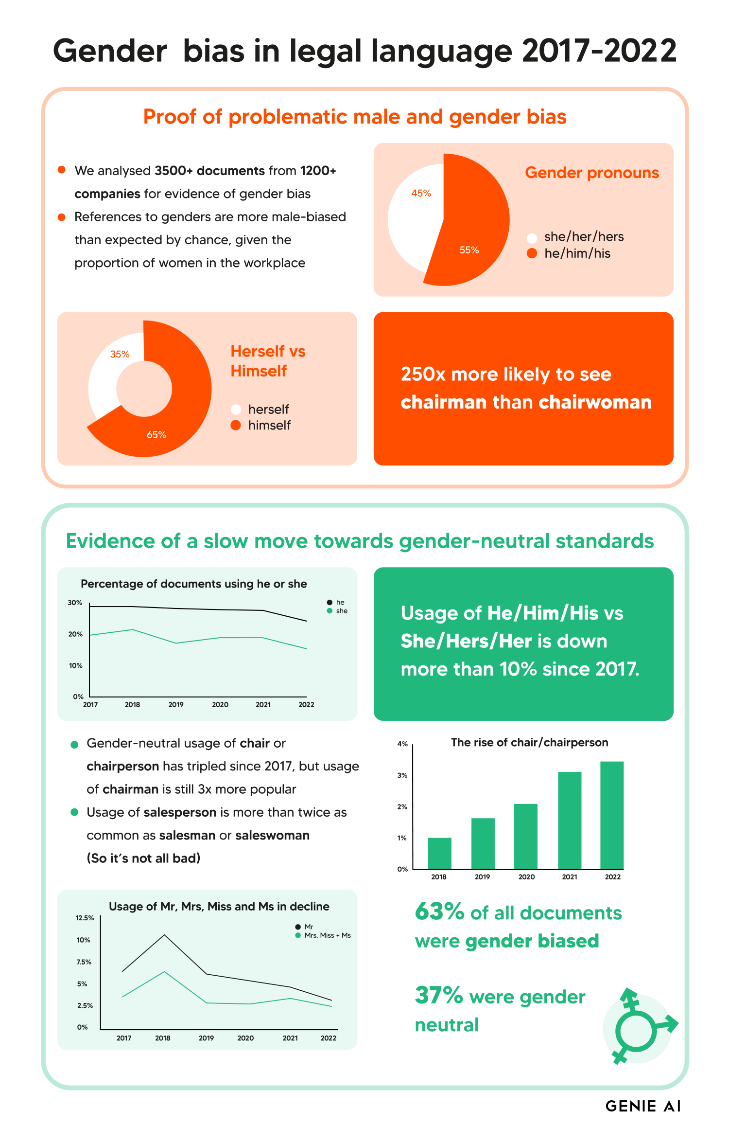 From simple pronouns such as ‘he’ or ‘his’ to more formal titles like ‘Salesman’ or ‘Chairman’, gendered terminology is rife within legal contracts. For example, contracts are 88% more likely to reference ‘himself’ rather than ‘herself’, and ‘Chairman’ is 250x more likely to be referenced in contracts than ‘Chairwoman’.