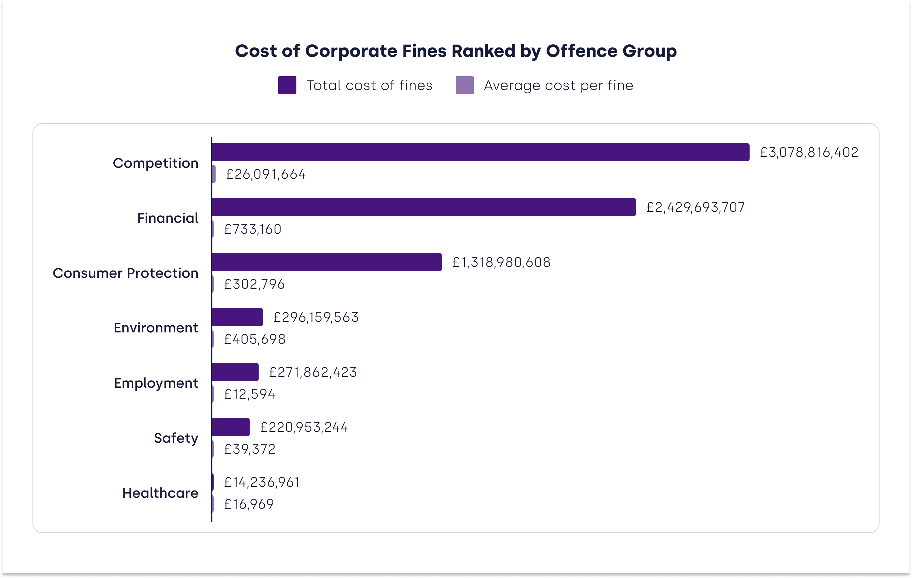 The third most costly fines have been for consumer protection related offences. These violations have totalled over £1.3 billion in fines, with an average cost of £303,000 per fine.