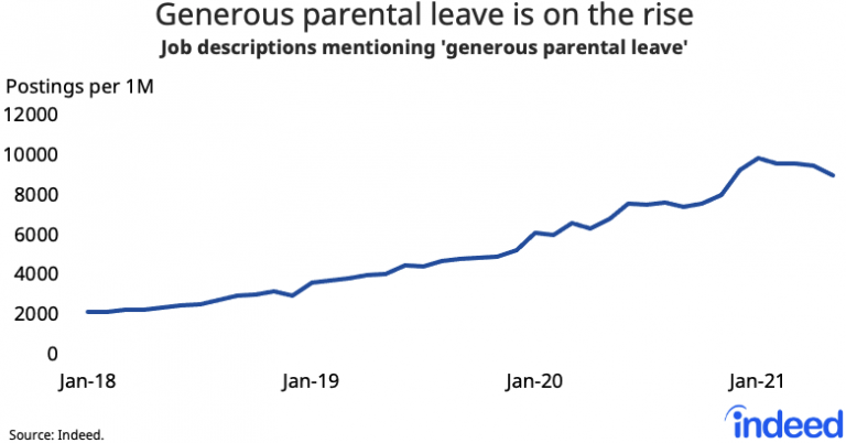 Analysis of the companies most likely to highlight ‘generous parental leave’ benefits in their job postings show a wide variety of sectors, including retail and healthcare.