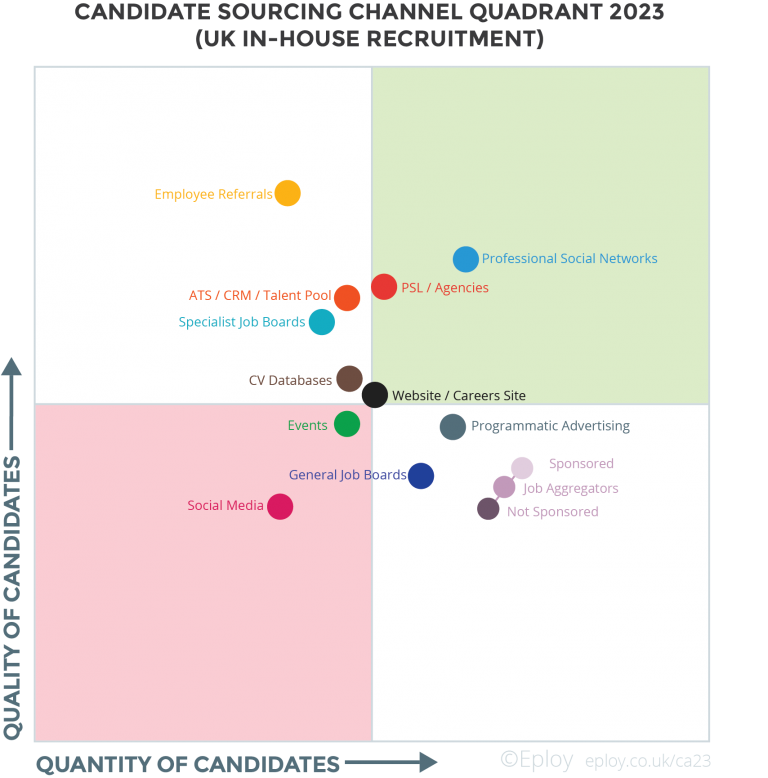 Eploy, an enterprise Talent Acquisition software leader, published the 7th Annual UK Candidate Attraction Report today. Eploy and HR Grapevine surveyed over 750 recruiters (90% in-house, 10% agency) to determine the candidate sourcing channels and recruitment marketing techniques that deliver the best results. Sourcing channels surveyed include company website/career site, talent pools, professional social networks, generalist job boards, specialist job boards, events, social media, employee referrals, CV databases, job aggregators, programmatic advertising and PSLs.