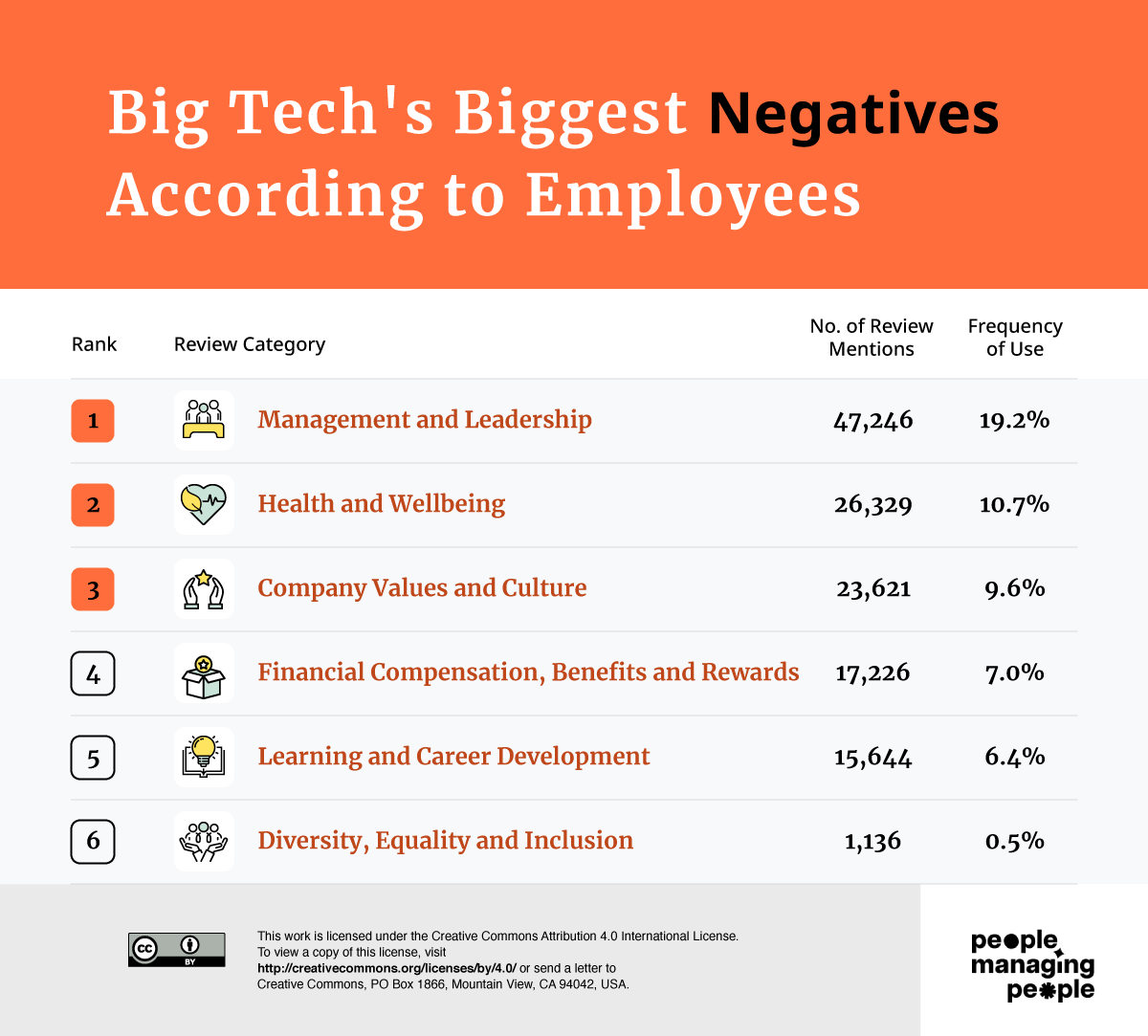 The study, which analyzed 245,990 Glassdoor reviews, reveals management and leadership is the biggest issue within Big Tech companies according to employees. It was cited 47,246 times – or 19 percent of the time.