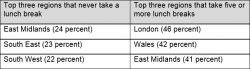 Three million workers across the UK take only one lunchbreak a week. Over a million self-employed Brits never manage to take time out for lunch. The East Midlands is the most likely region to never step away for a lunch break (24 percent) compared to those in London (46 percent) taking five or more breaks a week. Comment from psychologist and author of The Anxiety Journal, Corinne Sweet.