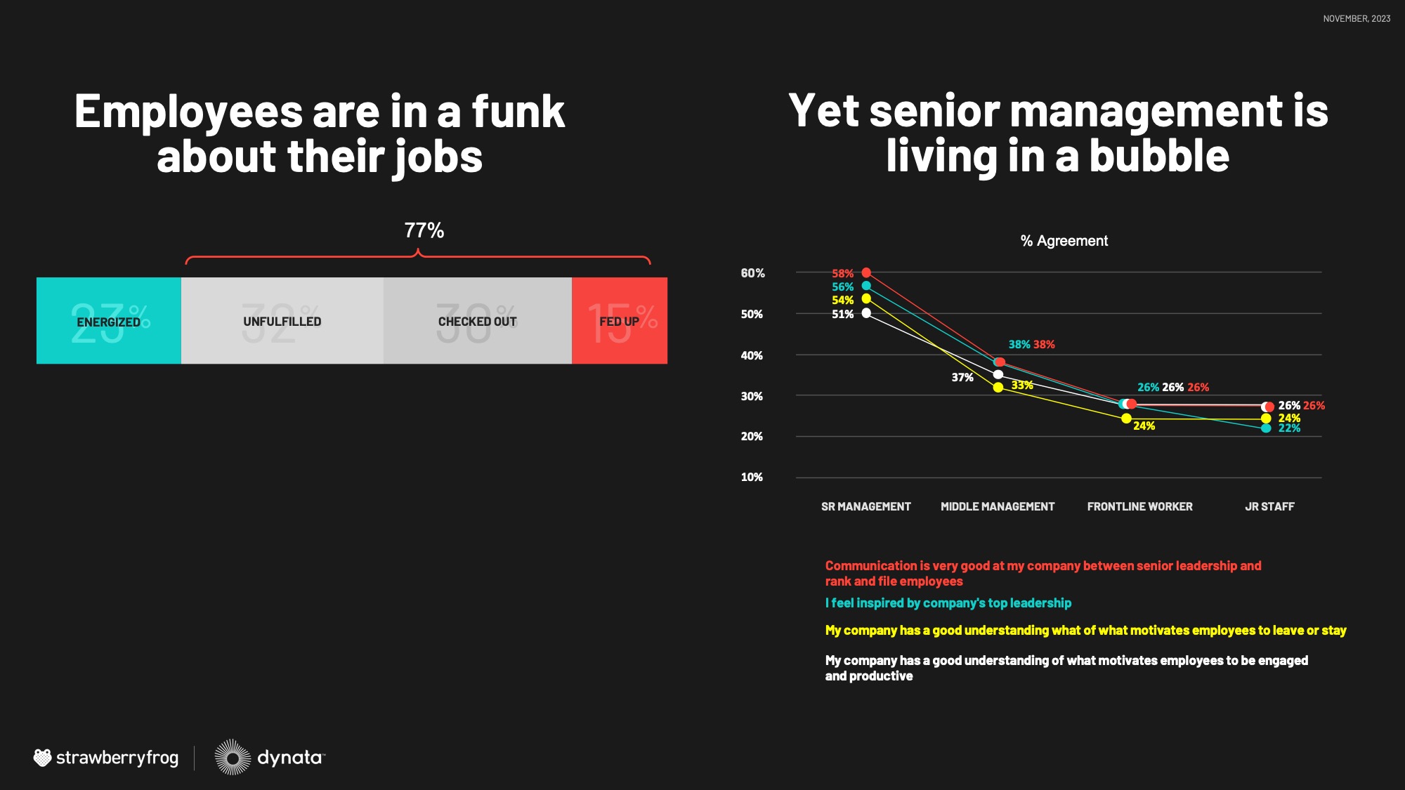 StrawberryFrog Head of Strategy, Chip Walker says, “In our research we learned that many of these disaffected employees stay only to avoid the hassles of searching for another position. They’re essentially sleepwalking through their jobs. Meanwhile, top executives are operating within what we’re calling a ‘Thriving Bubble,’ where senior leadership feels fulfilled and believes their organization offers clear purpose and direction—a sentiment at odds with their checked out and fed up workforce.”