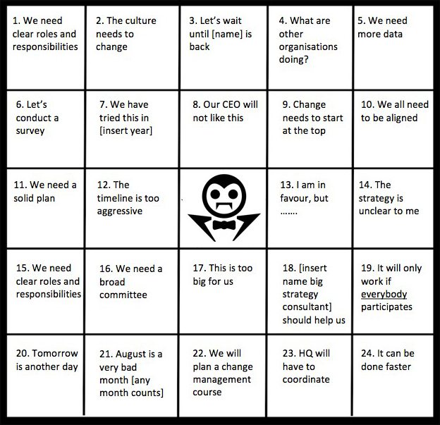 Change Resistance Bingo: print out the card below, hand it out during a meeting where the plan is discussed. When you hear a phrase that resembles a phrase on the card, tick the box. If you do not like the plan, use one or more of the phrases on the card. In that way, you can both slow down the plan and win the Change Resistance Bingo.