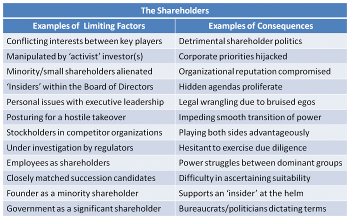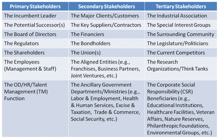 There are three key categories of stakeholders with a decreasing order of influence on the outcomes pertaining to the succession practices: