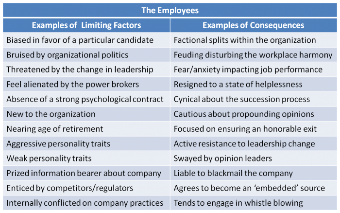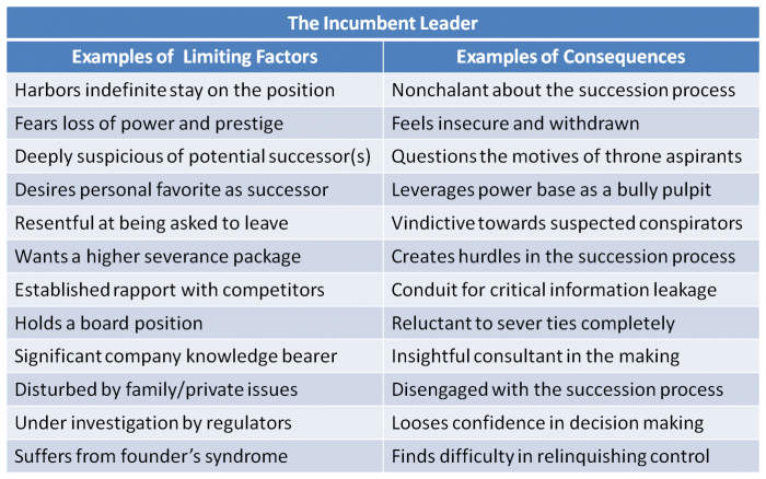 1. The Head of OD/HR/TM function maintains an updated and ranked confidential list of potential candidates, based upon defined competencies, agreed by the Incumbent Leader and ratified by the BOD. Examples of suitable parameters can include; academic qualifications, years of service, record of achievement, leadership experience, failure management, high emotional intelligence, strategic acumen, multidisciplinary knowledge, competitor(s) and industry insights, negotiating ability, presentation skills, assertiveness, charisma, decision making prowess, mergers and acquisitions exposure, reliability, confidentiality, pressure handling, 360 degree feedback, corporate citizenship behavior, approach to criticism, visionary capability, technology aptitude, key stakeholder understanding and management (e.g., shareholders, regulatory bodies, employees, union(s), client/customer, supplier/contractor, etc.)