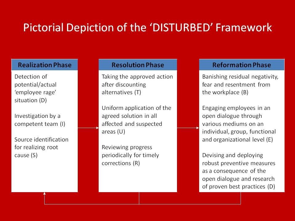One of the key controllable aspects is Employee Well-being, which is a significant aspect of the overall equation for corporate success.  Any undesirable shift in their behaviors at the workplace can be a sign of simmering misgivings that can manifest at unpredictable times and have the potential to seriously damage the ‘Employer’ brand in addition to critically disrupting the workplace harmony.  Therefore, it is imperative that organizations manage any ‘Employee Rage’ situations effectively and efficiently as an important part of operationalizing the talent management strategies.  This article focuses on providing a systematic approach to mitigating ‘Employee Rage’ situations, e.g., visible anger, demonstrative frustration, verbal discontent, virulent online postings, displayed aggressiveness, vented disagreements, violent confrontations, demeaning behavior, unethical measures, destructive tendencies, etc., by deploying the ‘DISTURBED’ framework to ensure a harmonious workplace within progressive organizations.  It has the following 9 elements: