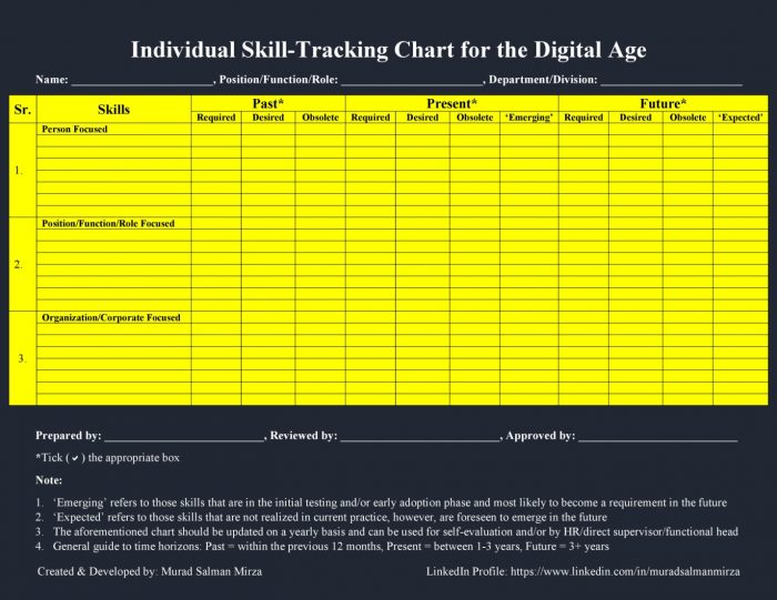 The key for astute professionals is to never starve a positive mindset with its ability to envision novel ways of adjusting to the dynamic demands of the digital world by failing to engage in an honest self-assessment of professional prowess while successfully addressing the ‘narrow’ compulsions of working in a particular organization. In this context, the following individual skill-tracking chart is being presented as a proactive tool to ensure that ‘irrelevancy’ never becomes a recurring nightmare for professionals seeking congruence to the new corporate norms: