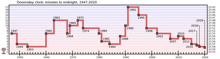 Since 1947 the members of the Bulletin of the Atomic Scientists have evaluated the world in the context of global issues that have negative consequences for humanity. They summarise the total risk using a clock with its hands set towards midnight based upon the lifespan of mankind on the planet. The initial clock was set at 7 minutes to midnight. At its most optimistic in 1991 the clock was set back to 17 minutes to midnight.