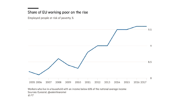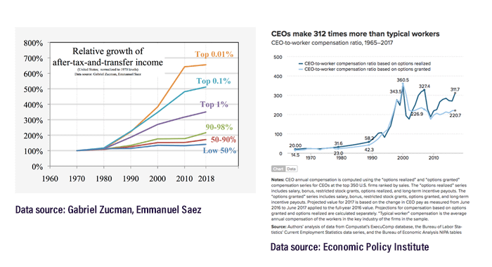 - Neoliberalism theory suggests that everyone benefits through the trickle-down effect of growing economies. In 1975 the average S&P 500 CEO compensation package was 25 times that of the median worker in the company. By 2017 this ratio was 312 and core worker wages have stagnated. In the last 15 years the number of working poor people continues to grow in the EU and USA. There is no trickle-down effect.