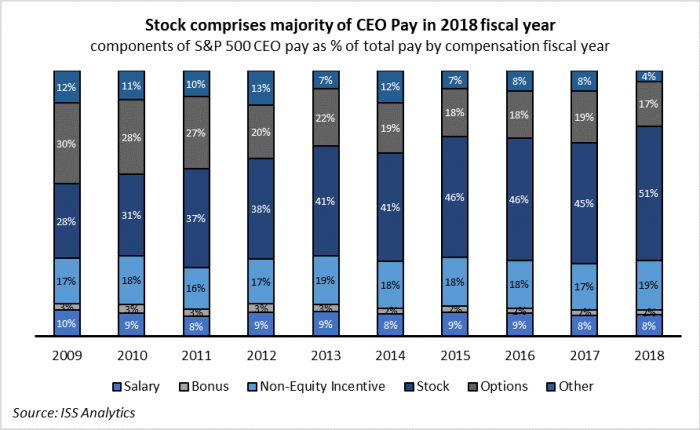 - The compensation packages of CEOs are ever-more linked to share price with a shift of CEO stock related compensation from 28% in 2009 to 51% in 2018. There is evidence that the higher the proportion of CEO compensation that is directly linked to stock the worse the medium to long term performance of the business.