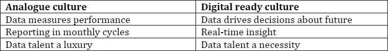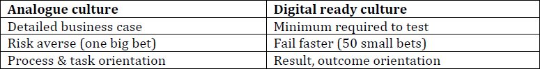 It’s also useful to remember that a digital culture is customer­‐centric by definition. It is about a focus on the customer experience irrespective of channel. Most companies just happen to be less mature in digital channels so this requires the greatest effort and targeted investment to keep up with customer expectations.