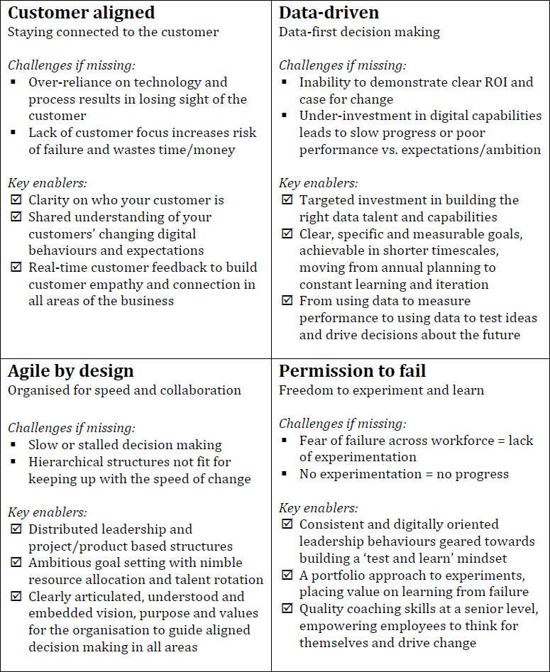 Organisational culture changes slower than technology does, which makes it critical that executives are taking steps to prepare their culture for digital transformation long before it could become a barrier to progress. Leaders won’t achieve their digital ambitions unless they build organisational cultures defined by agility and permission to fail, driven by data and obsessively connected to their customers. At a glance, here is a summary of the key challenges and enablers in each of these areas, to consider when assessing how ready your culture is for digital transformation.