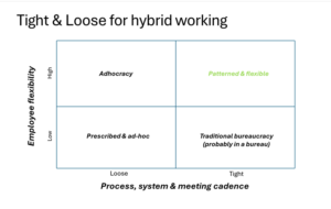The notion of “firm but not rigid” is helpful here, not least to help make the distinction between an exception to a rule and undermining intent. For example, recognising the difference between team days to support coordination and a blanket requirement for presence between certain hours; or the difference between key team touch points and expanding meeting invites for the sake of sharing information or inclusion.