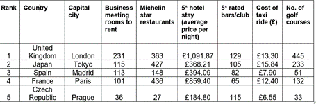 Tokyo takes second place, with rates for five-star hotel stays at around £368.21 per night, 105 five star rated bars and clubs, and the second highest number of Michelin star restaurants (427). Madrid ranks in third with 113 business meeting rooms, affordable five-star hotel stays and reasonably priced transportation with a 5 km taxi ride costing just £7.90.
