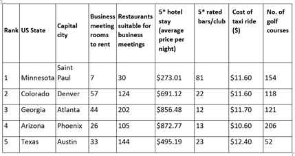 Coming in second is Denver, which has the highest number of business meeting rooms available to book (57) and 22 five star bars and clubs to choose from. Atlanta ranks in third place with 202 restaurants deemed suitable for business meetings and 121 golf courses.