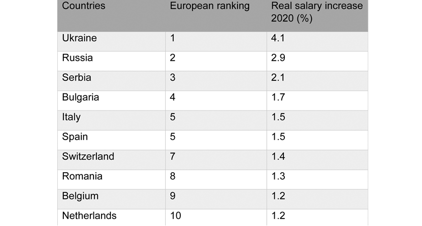 “After several tough years with salary rises lower than inflation – in 2015 they were 40.5% lower – Ukrainian employees may finally see some light at the end of the tunnel with the joint 5th highest real increases globally in 2020.. In 2020, workers in Ukraine are expected to receive a nominal increase of 10.0%, but with inflation expected to drop dramatically to 5.9%, this will result in an average real salary of 4.1% – the highest in Europe.”