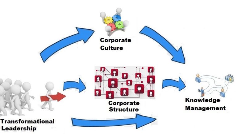 Corporate structure can be reshaped by transformational leaders to be more effective when the command center of organizations can disseminate information in a decentralized and organic way as opposed to the mechanical and centralized command center. Decentralized structures shift the power of decision-making to the lower levels and subsequently inspire organizational members to create new ideas and even implement them while centralized structures may negatively impact interdepartmental communications and inhibit knowledge exchange. Ergo, transformational leaders positively contribute to organizational knowledge management through building more decentralized and organic structures within organizations. The following figure provides a snapshot of how transformational leadership, corporate culture and corporate structure are linked.