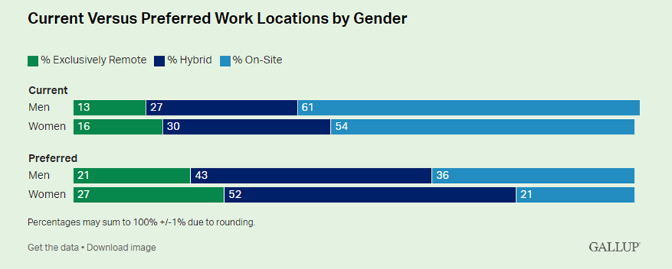 When we look at where employees are getting their work done by gender, women are more likely to currently be working in some form of hybrid work arrangement and to say they would prefer a hybrid arrangement in the future.