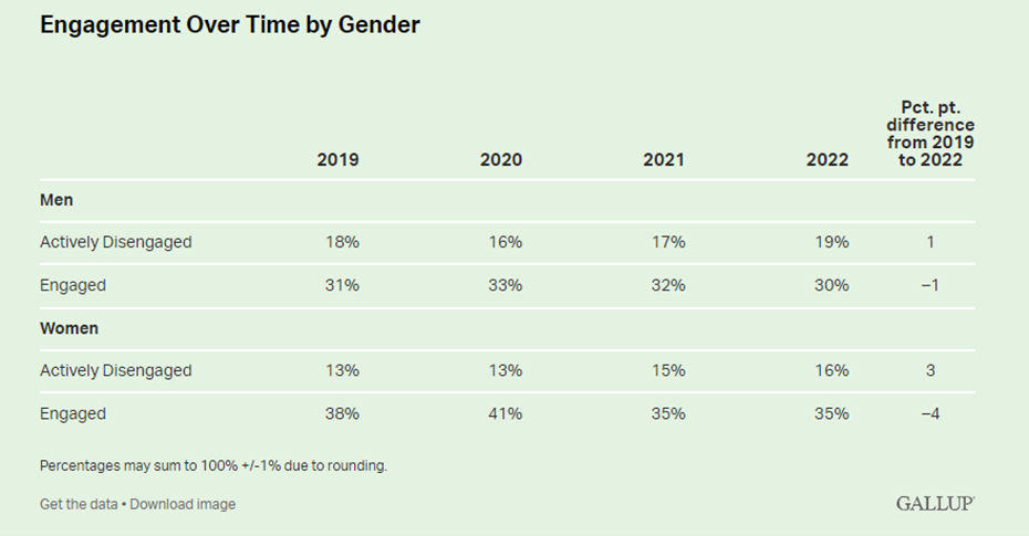 Whatever ground the employee engagement trend gained in 2020 has since eroded, with engagement levels now falling below where they were before the pandemic began. When we look at engagement trends by gender, specifically comparing 2019 and 2022, engagement among women is down by four percentage points compared with one point among men. Meanwhile, the percentage of women who are actively disengaged is up three points, compared with one point among men.