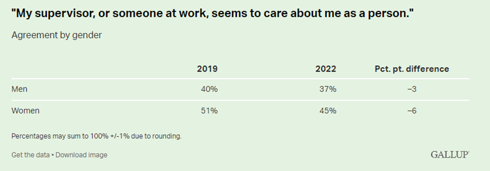 Historically, women tend to score higher on relationship-based Q12 items such as, “My supervisor, or someone at work, seems to care about me as a person.”