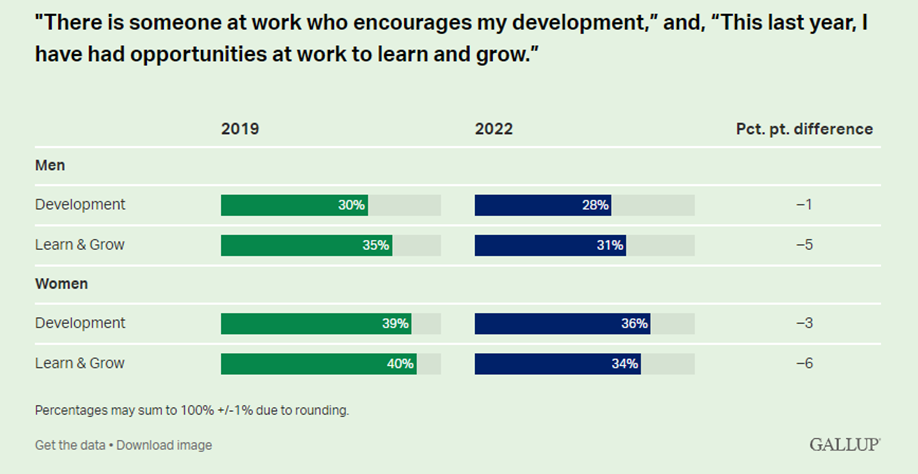 One of the most troubling findings about the engagement decline is related to development items by gender — specifically, “There is someone at work who encourages my development,” and, “This last year, I have had opportunities at work to learn and grow.”