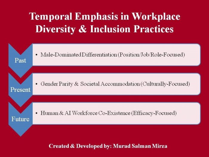 However, such measures often differ in their level of success with passive resistance being one of the key factors as an unfortunate side-effect of the ‘lack of buy-in’ from ‘concerned’ quarters. Nevertheless, multinationals (MNCs) have been inevitably at the forefront of driving the Diversity & Inclusion approaches as they compete in multiple markets with unique characteristics and need to have the ‘localized’ approach to overcome the challenges of ‘ground-based’ realities. They are also acutely aware of preserving the sanctity of the ‘corporate brand’ in an era of ‘empowered’ consumers/activists/campaigners riding boldly on the Digital waves. Their management approaches are often the ‘lighthouses’ for regional/indigenous businesses to modernization. However, this was not always the case. Let’s take an overview of the temporal emphasis in Diversity & Inclusion practices to appreciate the evolution of the corporate landscape and what the future holds in an era of artificial intelligence (AI), as follows: