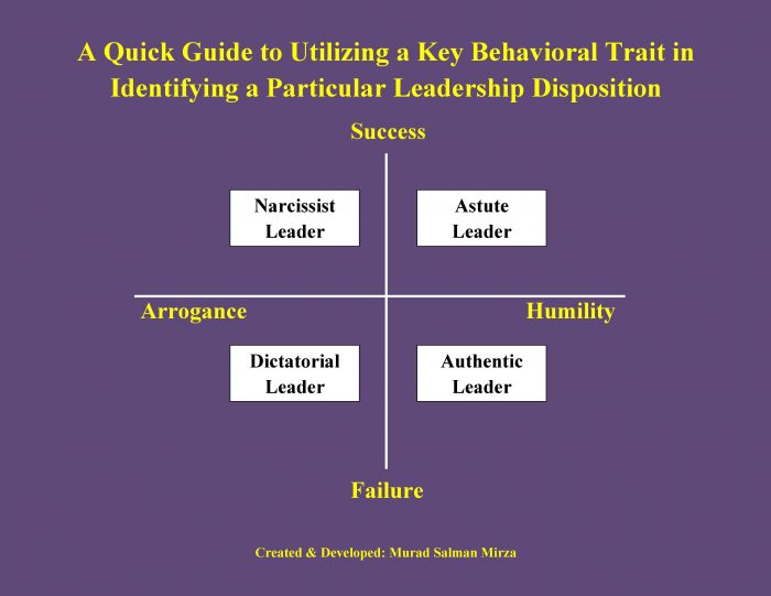 A rising trend among ‘hands-off’ leaders has been to excessively engage in the ‘curative addictions’ provided by savvy consultants to combat the challenges of staying relevant in the Digital Age, rather than, judiciously benefiting from their services as ‘galvanizing enablers’ for resuscitative purposes and managing the reins of progress themselves. Employees look to their leadership for vision, direction, role modeling and inspiration. However, if their confidence is not redeemed by an invigorating leadership then any attempt made to inculcate a profound sense of purpose to overcome difficult challenges can become an exercise in futility. The following chart depicts a simple method for utilizing a key behavioral trait, e.g., Humility vs. Arrogance, for identifying a particular type of leadership disposition pertaining to a specific outcome, e.g., Success vs. Failure, in the respective context: