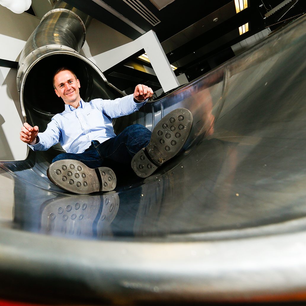 There’s a purpose for the slide, if you break people’s mindset, to have some play time, it releases the mind from the burdens, and I believe that’s where innovation happens. You can’t plan innovation, but you can create the conditions that let it thrive. In this building, we created space people can socialise and collaborate and we have a place called the Hub where people can have lunch together and talk about things off the agenda. People love it and that gives me the energy to continue with this sort of thinking.