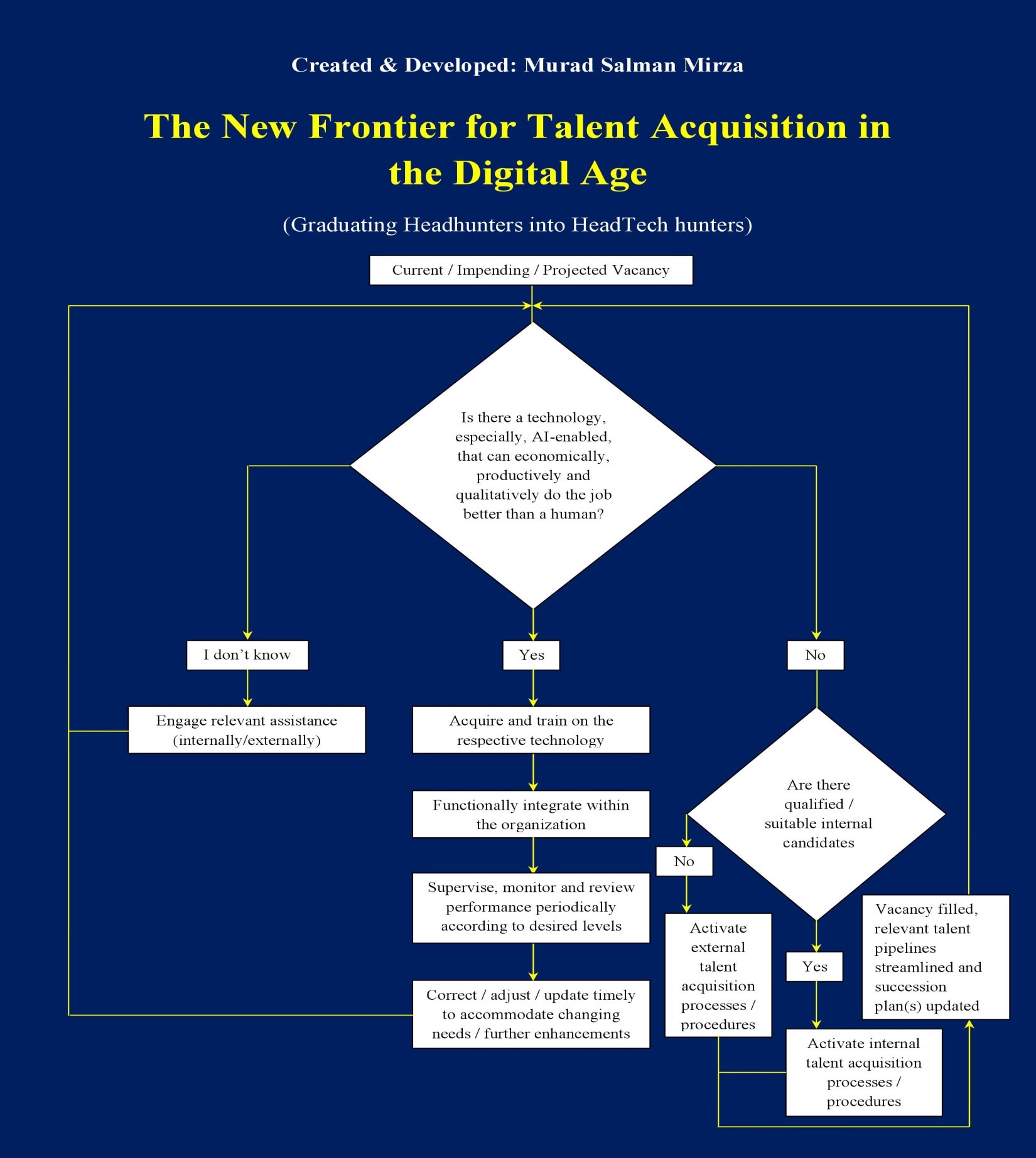 Additionally, the technology being used/developed/foreseen within the realm of talent acquisition is poised to phase out recruiting firms/headhunters/assessment centers themselves. Examples in the respective context include, the prospect of Artificial Intelligence (AI)-enabled assistants, e.g., Alexa (Amazon), Siri (Apple), Google Assistant (Google) and Cortana (Microsoft), etc., becoming recruiting-assistants by analyzing candidate data/information on the organization’s website, Augmented Reality (AR) providing real-time interview support, e.g., interviewers wearing AR glasses that can analyze human expressions/body movements to gauge the validity/truthfulness of responses, Virtual Reality (VR) headsets that create scenarios analogous to real-life situations/challenges for a particular role/function given to candidates for gauging insights into their abilities as an alternative/replacement for time-consuming/resource-draining /expensive/immobile assessment centers, etc. This mandates a strategic rethink of how recruiting firms can remain relevant in the Digital Age by embracing/evolving into a new form of recruiting/talent acquisition paradigm that caters to both ‘human’ and ‘non-human’ workforce. Consequently, the term ‘HeadTech Hunter’, rather than, ‘Headhunter’ is proposed in the respective context to enable compatibility with the following new process of acquiring talent in the Digital Age: