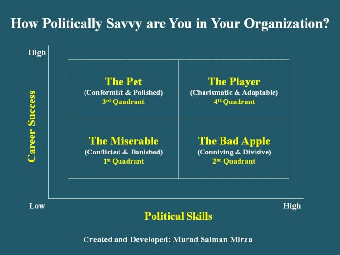 The 4th quadrant highlights ‘The Player’ manager. This person has high political skills and uses them at just the right time and place to ensure desired outcomes in terms of career progression. Such a person has mastered the ability to garner attention with an air of confidence that borders on arrogance and is able to woo superiors and subordinates alike with a professional charisma that attracts people like a magnet. Performance appraisals routinely claim the uniqueness of contributions made by the respective person who is also the envy of peers in terms of emulating career success. Additional skills embedded in the persona of such a manager include being able to manage/maintain a healthy relationship with the ones in the other three quadrants, especially, in terms of facilitating the completion of difficult assignments. Such managers often carry the impregnable image of ‘someone who can do no wrong’.